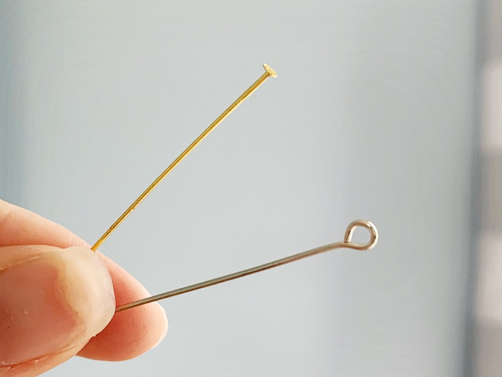 Pins are used to attach a bead (or multiple beads) that you want to dangle on a piece of jewelry. With both types, once you’ve strung the bead(s) onto the pin, you’ll create a loop on the other end. Headpins are blunt on the end and sit flush against the bead, while eyepins have a loop on the end so you have a connector point on each side of the bead. You’ll often use these in conjunction with jump rings to connect the pieces of your jewelry together.