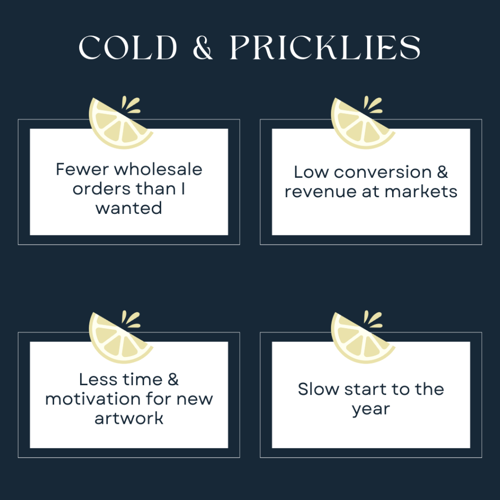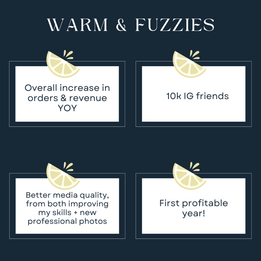 This definitely warrants its own separate post. And this is definitely not exclusive to this year. In fact, I did two markets this year as I’ve continued to incrementally scale back on markets over the past couple of years. While I have learned market lessons the hard way, I still go into each one optimistic and then, frankly, disappointed after seeing market shoppers’ responses (really, lack thereof) to my products. So unfortunately, seeing that low conversion rate, and therefore low revenue, has been a recurring theme over the past few years, including this year. While there are many nonfinancial, qualitative positives to markets, I’m there to make money at the end of the day. So when the revenue just isn’t there, I can’t justify the time I spend doing them. Like I said, deserves its own post, but for the sake of this post, lack of success at markets was once again a negative this year.